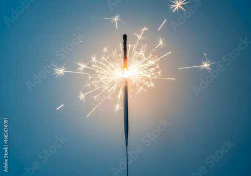A single burning sparkler emitting bright, glowing sparks against a blue background