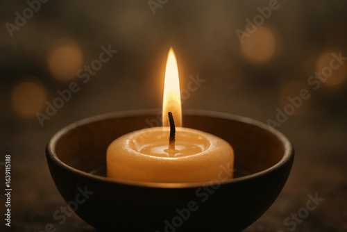 A single candle burns with tranquility in a dimly lit room, casting a warm glow on its surroundings