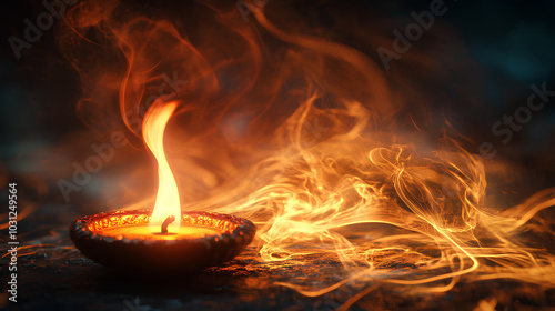 A single candle flame illuminates a dark background, creating smoky trails that dance and swirl around it.