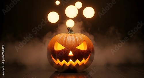 A single carved halloween pumpkin with a scary face glowing in the dark with smoke and bokeh lights