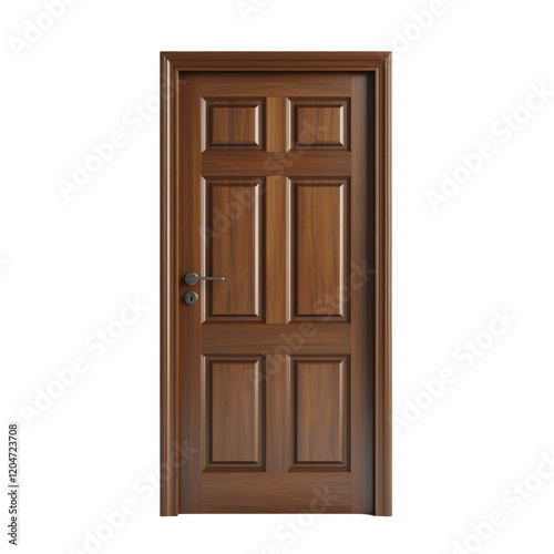 A single closed brown wooden door with a six panel design is set against a plain white wall.