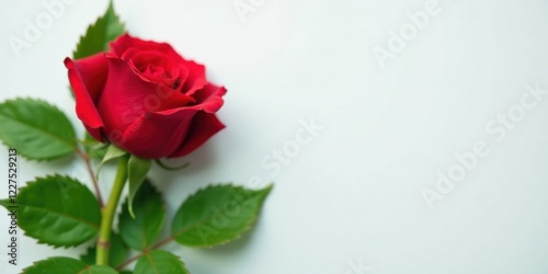 A Single Crimson Rose with Lush Green Foliage on a Pale Background