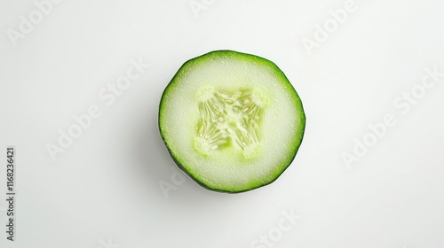 A single cucumber slice on a white background