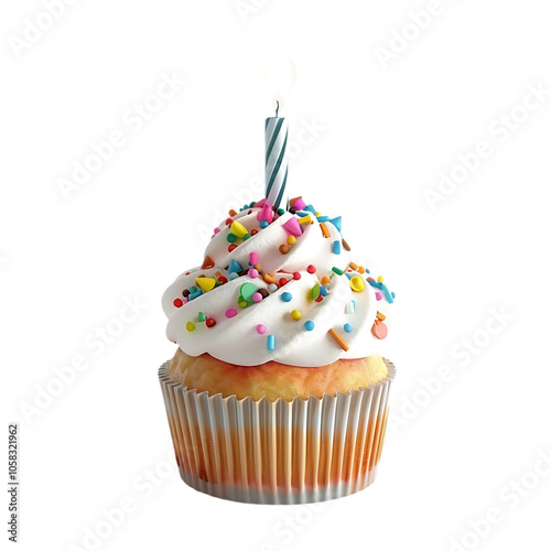 A single cupcake with white frosting, colorful sprinkles, and a single lit candle.