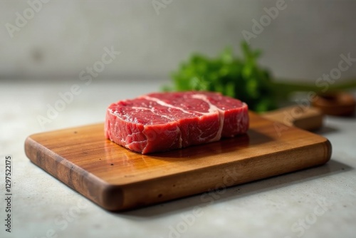 A single cut of raw beef steak rests on a light brown wooden cutting board, ready for preparation
