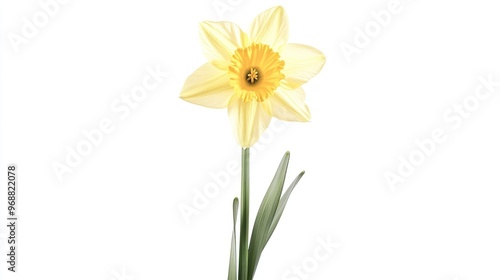 A single daffodil flower with yellow petals and green leaves against a white background.