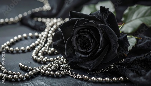 A single dark black rose rests entwined upon delicate silver gothic jewelry.