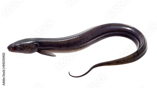 A single, dark-colored eel with a sleek, serpentine body, isolated against a black background. The eel's skin is smooth and glistening.