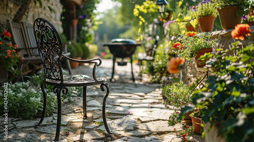 A single decorative wrought iron chair with elegant scrollwork, placed on a flagstone patio in dappled sunlight.