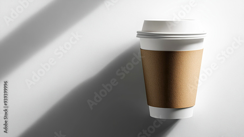 A single disposable coffee cup with a cardboard sleeve against a plain background under natural light, suitable for use in marketing for coffee shops, beverage websites, or social media posts,