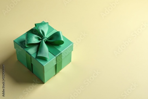 A single, elegantly wrapped gift box, tied with a vibrant green satin ribbon, rests on a pale yellow surface, perfect for celebratory occasions
