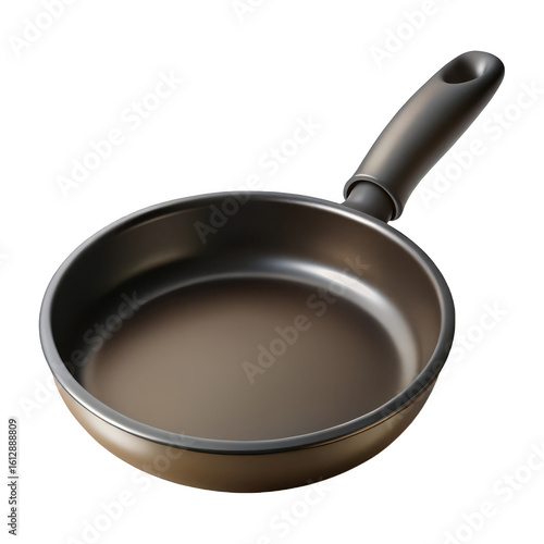 A single empty metal frying pan with a dark handle presented isolated on transparent background for culinary use