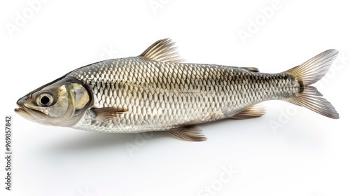 A single fresh fish with scales, fins and tail on a white background.