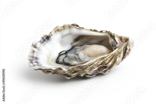 a single, freshly opened oyster on a pure white background, glistening with dew and revealing its tender flesh