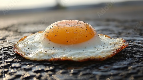 a single fried egg sizzles on the hot asphalt symbolizing extreme heat waves and soaring temperatures in an urban city environment illustrating climate change effects.illustration