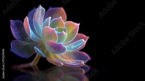 A single glowing succulent plant in a dark lab, its leaves emitting soft multicolored bioluminescence.