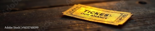 A single, golden ticket rests on a rustic wooden surface, illuminated by a warm, inviting light The ticket gleams, promising adventure and excitement , light, item