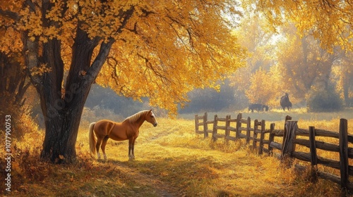 A Single Horse Stands in a Field of Golden Autumn Leaves Under a Canopy of Trees