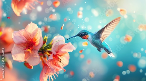 A single hummingbird hovering near a vibrant flower, wings a blur of motion.