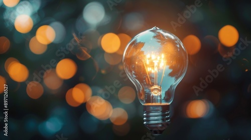 A single lightbulb shines brightly against a backdrop of soft, warm bokeh lights, symbolizing inspiration, innovation, creativity, knowledge, and new beginnings.