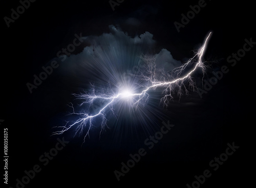 A single lightning bolt strikes through a dark sky, creating a bright flash of light.