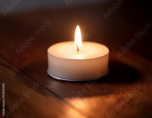 A single lit candle on a dark wooden table, symbolizing hope and solitude in a minimalist setting.