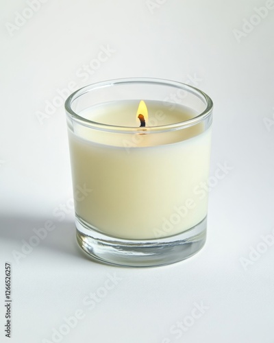 A single, lit ivory candle in a clear glass jar sits on a white background. Soft light illuminates the scene, creating a peaceful and calming