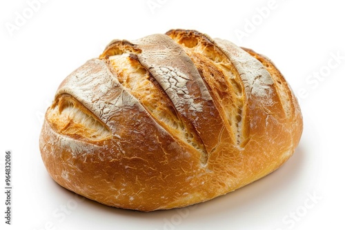 A single loaf of bread placed on a clean white surface, ideal for food photography and branding