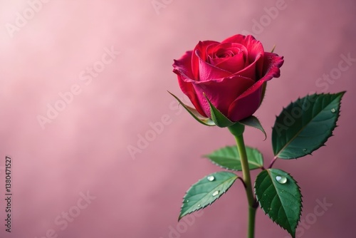 A single long-stemmed rose with tiny water drops on its thorny stem and leaves, flower details, roses