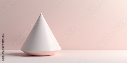 A single, off-white cone shape rests on a pale pink surface against a pale pink backdrop
