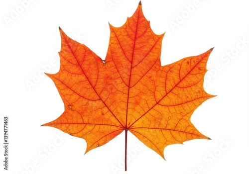 A single orange maple leaf with detailed veins isolated against a white background in close up view isolated on white background
