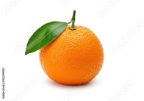 A single orange with a green leaf attached to the stem on a plain white background in a studio shot