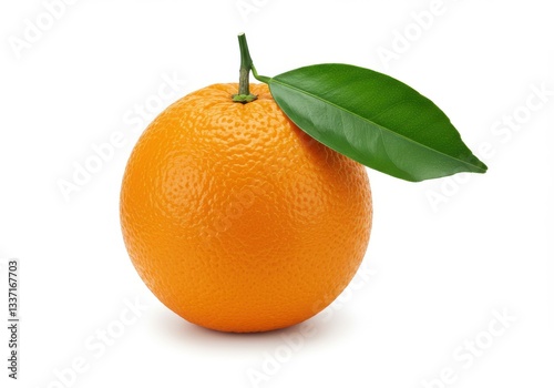 A single orange with a green leaf attached to the stem on a white background in a studio shot