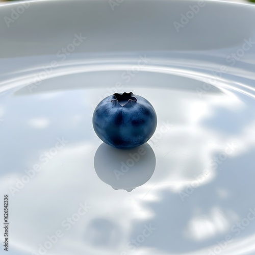 A single perfect blueberry sits on a glossy white plate, its dark blue skin beautifully reflecting the soft clouds of the sky. This is a clean, minimalist photo of fresh, healthy fruit.