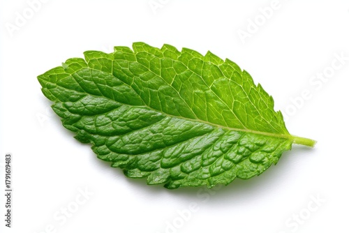 A single, perfect, fresh green mint leaf, isolated on a plain white background. Shot with clean studio lighting, no shadows. Perfect for drink, mojito, or food decoration.