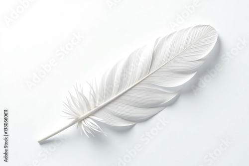 A single, perfect white feather against stark white backdrop, minimalist, freedom, delicate