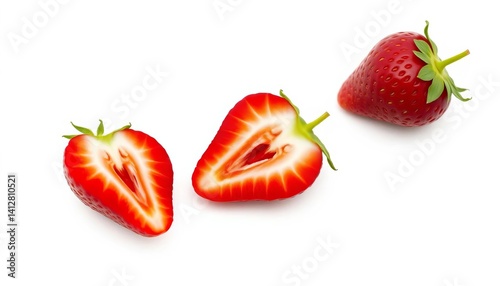 A single, perfectly ripe strawberry, halved, showcasing its vibrant red interior and seeds, isolated on a pure white background, freshness, juicy