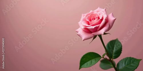 A single pink rose bloom with glossy green leaves and stems, nature, stem