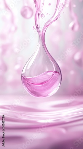 A single pink water drop hangs suspended in the air, about to fall into a rippling pool of the same liquid.