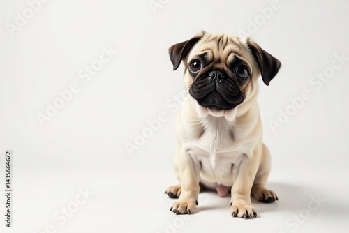 A single, playful pug against a pure white backdrop, pug, playful