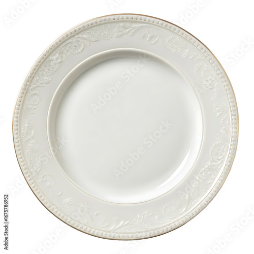 A single porcelain dinner plate isolated on a transparent background