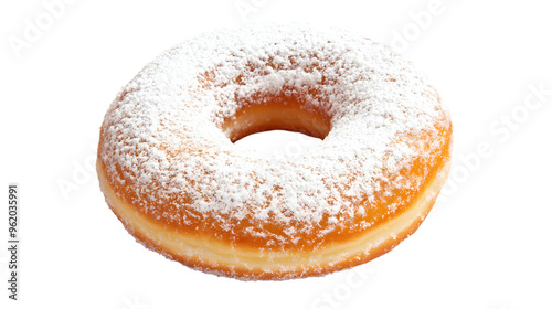 A single powdered sugar-dusted doughnut with a golden fried exterior, resting neatly on a clean white background, no shadows