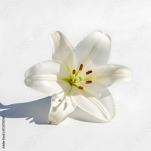 A single, pristine white lily rests gracefully on a plain white background, showcasing delicate petals and a central cluster of vibrant stamens.