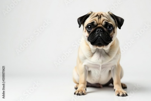 A single pug, viewed from front, on pure white backdrop, background, dog face