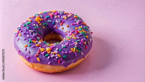 A single purple donut with colorful sprinkles, a tempting and sugary treat on a pink background