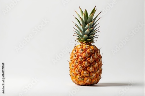 A single ripe pineapple sits alone against a clean white background, its spiky crown reaching upwards, refreshment, skin