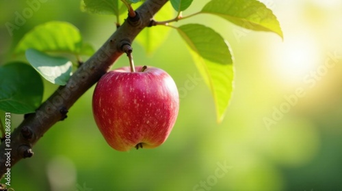 A single ripe red apple hangs from a branch, bathed in sunlight, surrounded by vibrant green foliage in a tranquil orchard setting.