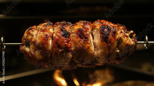 A single roasted chicken, its golden skin shimmering under the spotlight, is proudly displayed on a large metal skewer, its meat cooked to perfection and its bones securely fastened.