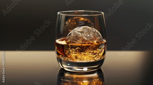A single rocks glass with a golden-brown drink and a large spherical ice cube