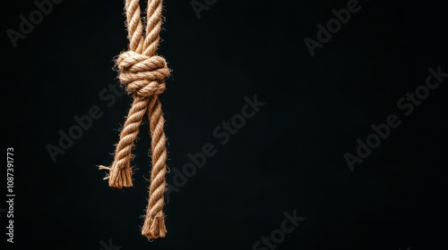 A single rope with a tight knot hangs against a dark minimal background, symbolizing tension and focus in a minimalist style representing inner strength.